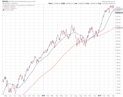 Si queremos otro dato más podemos ver la curva de nuevos ascensos y descensos del NYSE, donde se aprecia que todo ese período ha ido subiendo, y ahora parece que está haciendo un pequeño techo y empieza a corregir.