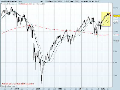 En condiciones normales, yo creería a fe ciega en el rebote en este soporte, por la gran importancia que tiene, sobre todo por la distancia tan grande temporalmente hablando, pero lo que me preocupa especialmente es que las subidas de las últimas semanas en todos los índices americanos, las velas se han separado enormemente de la media de 30 sesiones, y lo suyo es que haya un recorte hasta esta zona, y de hecho en gráficos diarios se aprecian perfectamente divergencias bajistas en los tres índices que indican que así va a ser. Aquí tenéis como ejemplo el gráfico semanal del Dow, donde ya se aprecia lo que puede ser el inicio del rebote que comentamos: