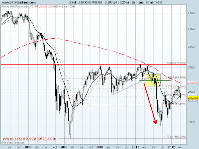 Si vemos el Euro Stoxx entró fulminantemente en una etapa bajista en julio de 2011, llegando a caer desde los 3.046 puntos de inicio de 2010 a los 1.934 puntos correspondientes a los mínimos de septiembre de 2011, un 36,50%, que fue cuando nosotros hicimos mínimos del año en la zona de los 7.500.