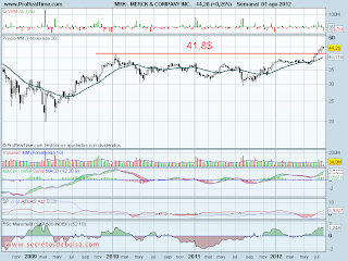 De Pharmaceuticals & Biotechnology destacamos Merck & Compañy Inc.. Tras dos años y medio en un rango lateral ha conseguido romper la resistencia marcada en los 41,8$ con fuerza. Habría que esperar a que se diera un pullback (si se da) colocando el stoploss en los 36,8$ y de esa manera podríamos entrar con menos riesgo, ya que entrando en el precio en el que se encuentra actualmente, los 44,28$, asumiríamos un riesgo en esta operación de un 16,8% que es un poco elevado.