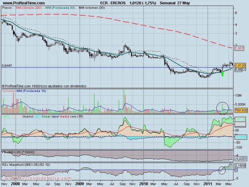 Sin embargo, el resto de reglas fueron todas positivas, sobre todo el gran aumento de volumen en esa semana al romper por poco el máximo de 0,94€, que nos marcaba el límite a superar, tras ponerse la cotización por encima de la MM30 una vez dicha media tornó a positiva su pendiente.