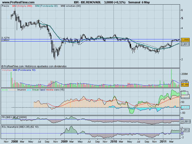 Si, ahora, consigue superar los 3,12€ con volumen y la FR, que está adquiriendo pendiente positiva, se pone en valores por encima de cero junto con el RSc Mansfield que ya está en positivo y, además de todo esto,  las manos fuertes se interesasen por el valor, Iberdrola Renovables podría entrar en una fase alcista, donde la primera resistencia la tiene en 3,55€.
