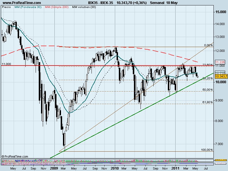 Como se puede ver en el gráfico semanal, el Ibex, desde que perdió el nivel entorno a los 11.000 puntos y con un alto volumen de negociación en abril del pasado año, lleva hecho unos 6 ataques a la zona, pero sin éxito ninguno, a la vez que ha ido consolidando un importante nivel de soporte, con cuatro puntos de apoyo, siendo el primero de ellos el que coincidió con el mínimo del índice de los últimos años, en marzo de 2009.