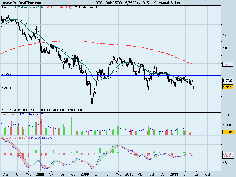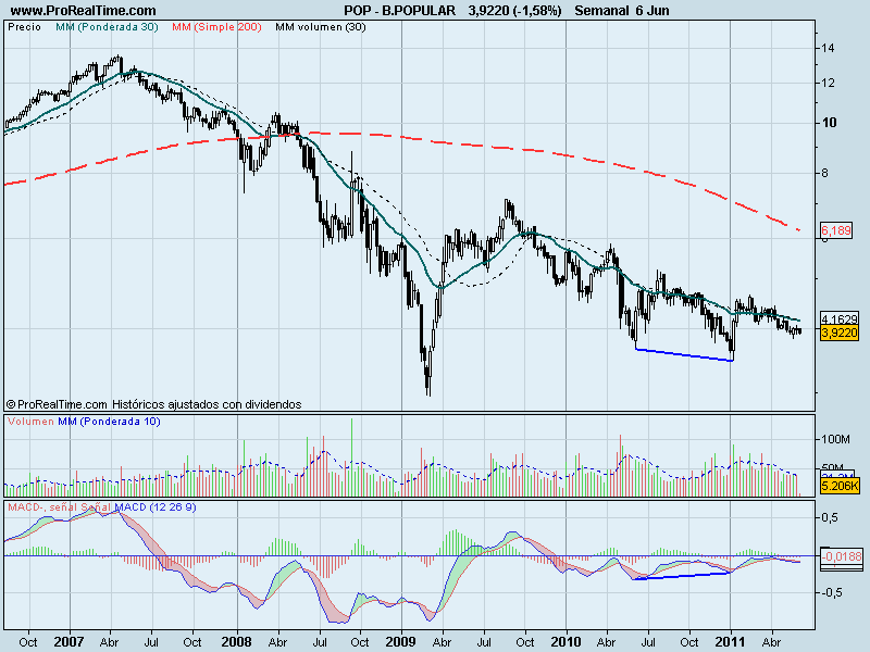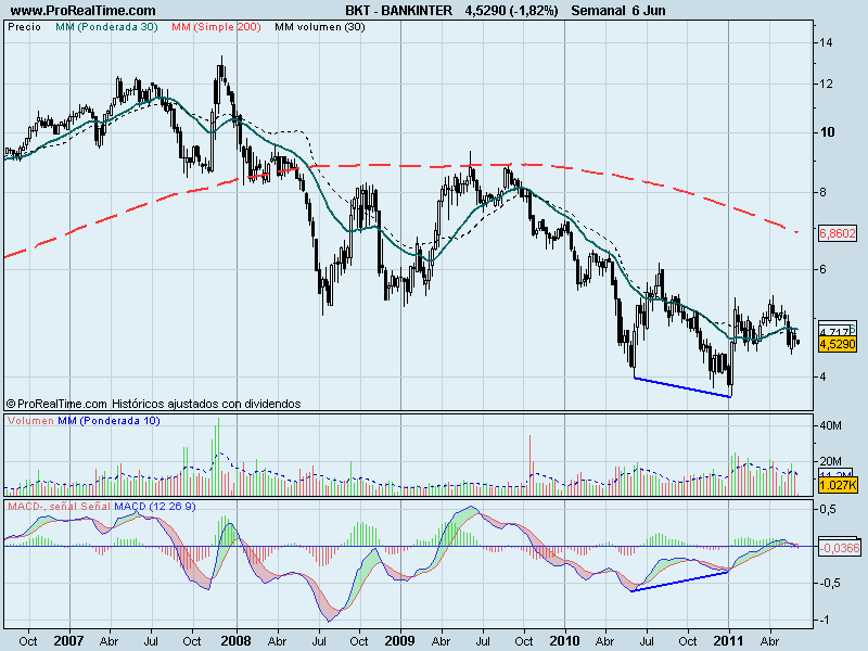 Pero viéndolas más en detalle nos percatamos de que hay algo más en común en casi todas ellas. Todas, a excepción de Banesto, tienen una divergencia alcista del precio con el MACD incluida la gráfica del sector de servicios financieros. Y en Banesto el precio está en zona de soporte que corresponde a un doble suelo.