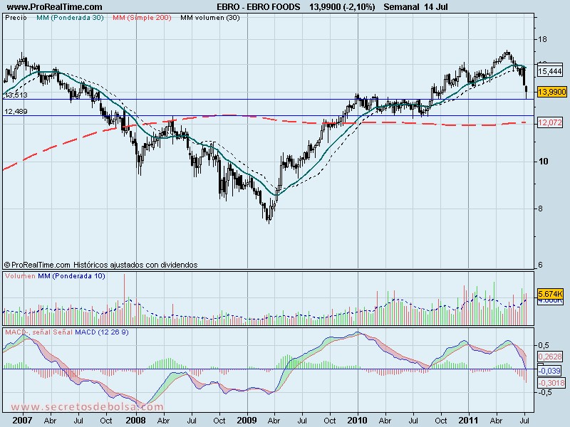 analisis tecnico-ebro foods-15 de julio de 2011A principios de julio comentábamos en un artículo que Ebro Foods dibujó una divergencia bajista que le llevó a unas caídas que ya en aquel momento acumulaban un 14%. Pues bien, las caídas han continuado e incluso ha roto el soporte de los 14,35€ llegando hasta la zona de los 13,52€ que es donde se encuentra el siguiente soporte y que por ahora está respetando.
