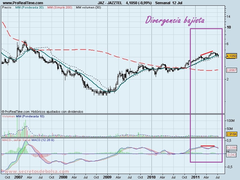A principios de junio habíamos comentado que Jazztel había dado señal de entrada a principios de noviembre del año 2010. Desde ese momento el valor comenzó un ascenso perfecto. Pero no fue hasta finales de junio cuando se vislumbró una divergencia bajista del precio con el Macd.