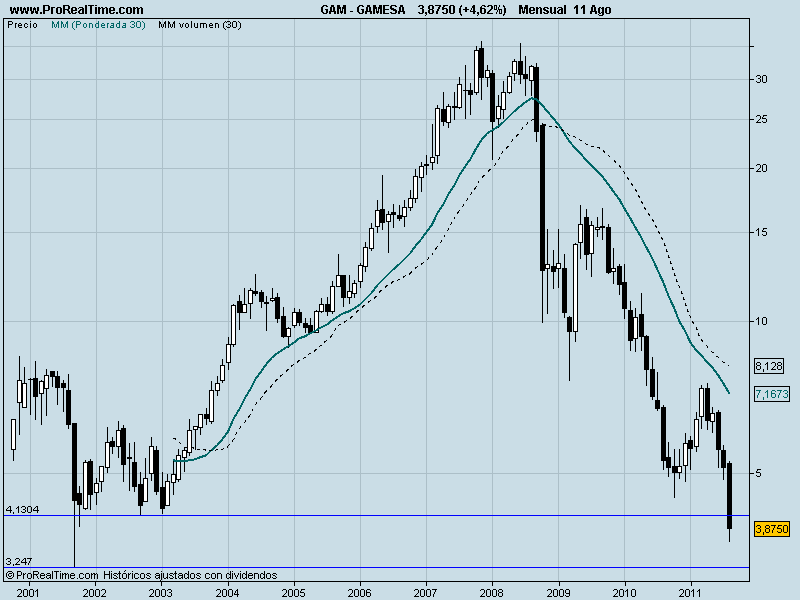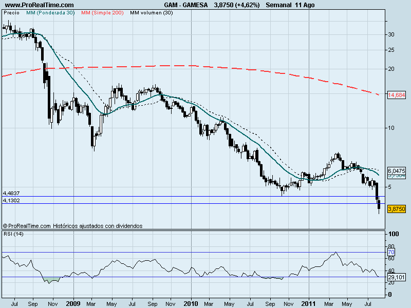 Hemos querido hacer un análisis de Gamesa, puesto que queríamos buscar si hay algún punto próximo de parada, porque viendo la gráfica observamos que desde que empezó la crisis en la que estamos inmersos desde el segundo semestre de 2008, en donde en valor se encontraba cotizando en la zona de los 35€, se ha venido para abajo sin dar tregua, y ayer Gamesa cerró en 3,8750€, es decir, casi 10 veces menos.