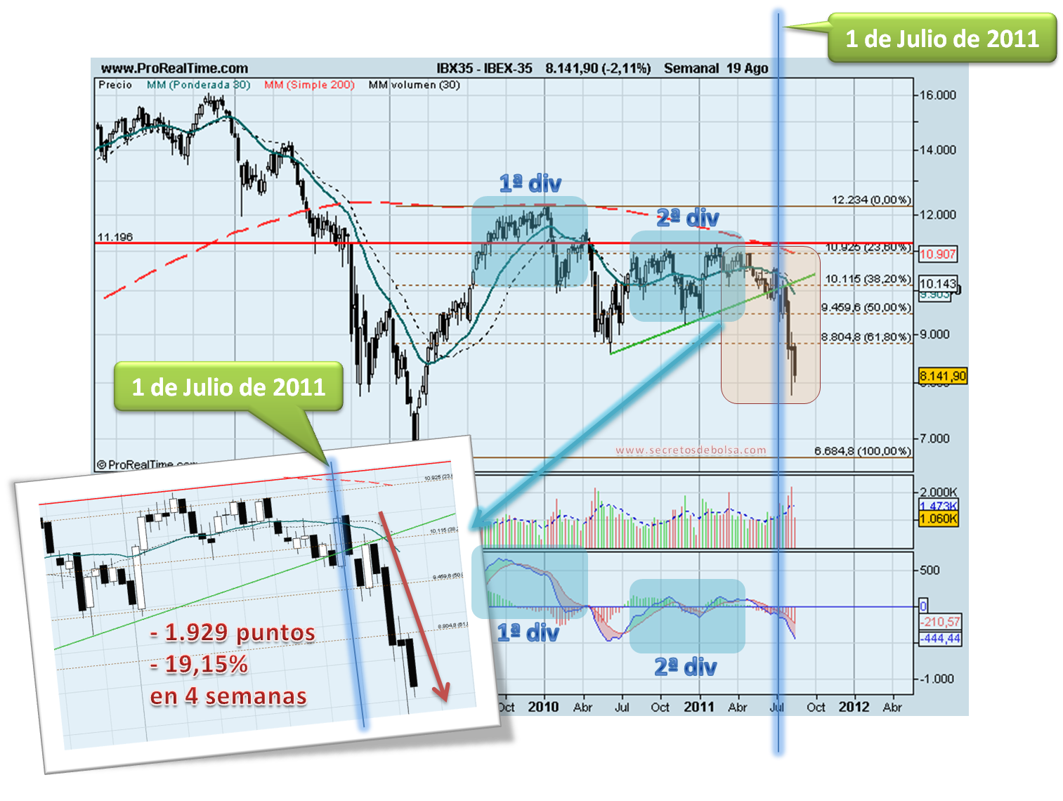 Las gráficas están divididas en dos partes por una línea vertical azul, que marca la situación del índice a viernes 1 de julio de 2011 puesto que el artículo lo publicamos el domingo 3 de julio con esos datos. De esta manera resulta fácil ver lo que aconteció a continuación.