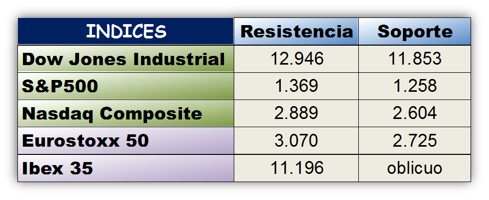 Para poner de manifiesto este razonamiento vamos a rescatar el artículo que publicábamos el 3 de julio de 2011 (“Referencias de los principales índices”), momento en el que los principales índices se encontraban en máximos, momento en el que muchos analistas decían que el Dow Jones seguiría subiendo, que el Ibex había mejorado mucho su aspecto, etc.En aquel artículo explicábamos por un lado la situación del Dow Jones, S&P500 y Nasdaq Composite para ver cómo estabas las cosas en Estados Unidos, y por otro lado hacíamos el análisis del Eurostoxx y del Ibex 35 para contrastar en primer lugar nuestro selectivo con el referente europeo y luego con EEUU.