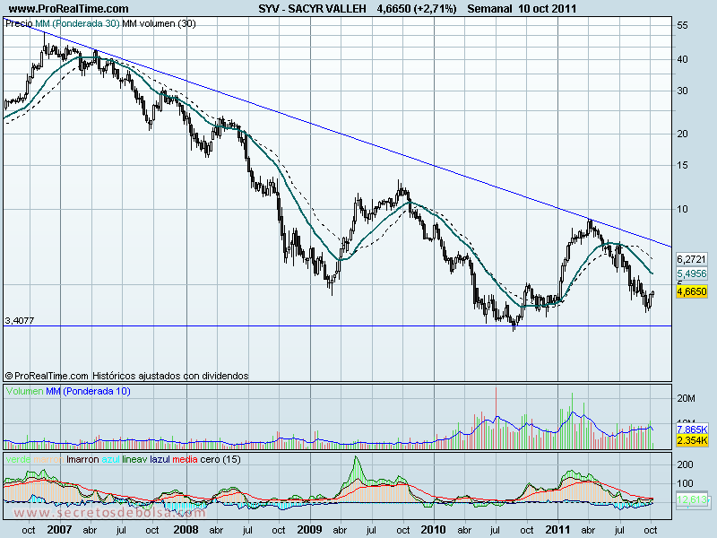 A principios de este año Sacyr nos dio una gran alegría después de revalorizarse en apenas tres meses más de un 100% pasando de los 4€ en enero a los 9 en abril. A partir de aquí comenzó a darse la vuelta coincidiendo con la resistencia oblicua que acompaña al valor desde finales del 2008 y que marca una directriz bajista.