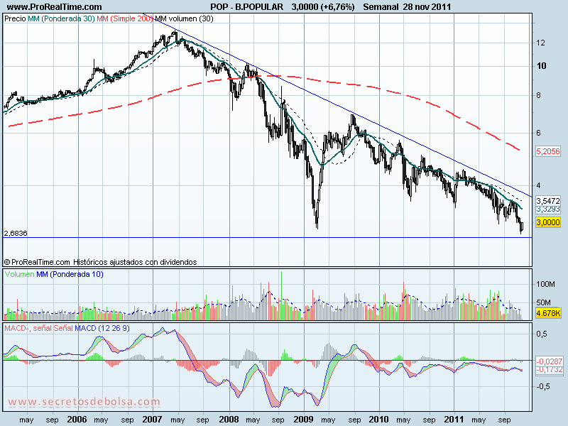 analisis tecnico de-banco popular diario-a 29 de noviembre de 2011De momento la mm de 30 sesiones sigue siendo negativa pero en lo que llevamos de semana ha habido inyección de dinero por parte de las manos fuertes, y si nos fijamos en la gráfica de diario el gap del que hablábamos en el último artículo de Banco Popular todavía no se ha cubierto.