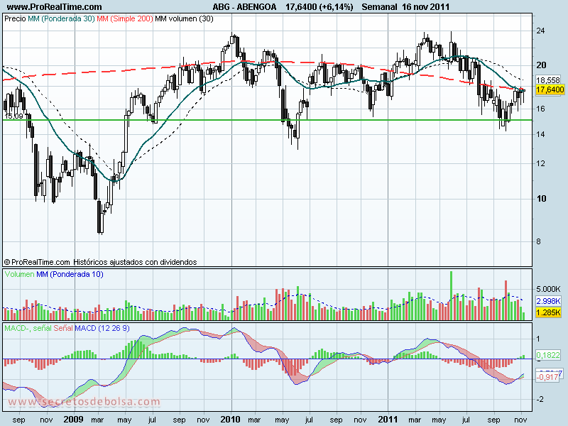 Es importante mencionar que en este mes y medio de subida el volumen ha sufrido una bajada importante que hace temer que esto no ha sido más que un recorte alcista de una bajada que ya ha comenzado. Como podemos ver el precio a principios de octubre se había alejado bastante de la mm de 30 sesiones que tiene una pendiente bajista y era necesario una pequeña recuperación del precio para acercarse a la misma y en su caso continuar la caída. Además, el resultado obtenido ayer en Abengoa a cierre de sesión que ha sido espectacular (6,14%) no ha estado apoyado por las manos fuertes que son las que inyectan dinero en el el valor.