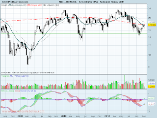 Pero durante las semanas siguientes el precio volvió a testear de nuevo el soporte y se volvió a impulsar para llegar hasta los 18€. Sin embargo se ha encontrado con la resistencia que se generó la primera vez que el precio llegó a ese nivel de precios después del 2º intento de impulso desde el soporte en la semana del 24 de octubre y no es capaz de atravesarla.