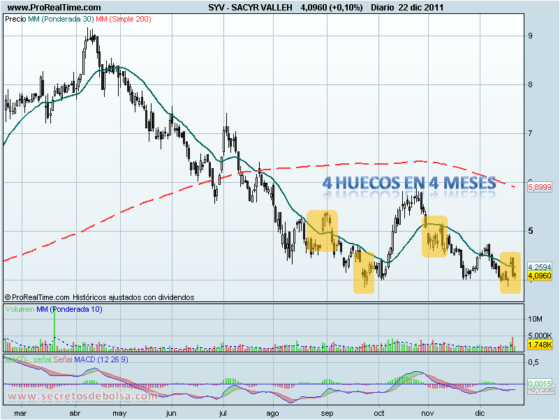 Por tanto entendemos que merece la pena seguir estos huecos en Sacyr, porque en combinación con otros criterios técnicos nos pueden ofrece posibilidades interesantes a corto plazo, y ello especialmente si los gaps se siguen dando en zonas de congestión como las que acabamos de ver, donde no cabe duda de que no se va a tratar de un gap de escape en zona de resistencia o soporte.