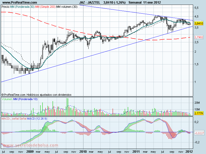 analisis tecnico de-jazztel-a 12 de enero de 2012Actualmente el valor se encuentra en un triángulo de resistencia y soporte oblicuos que cada vez estrecha más su campo de acción. Ambas tienen gran consistencia debido a que han sido respetadas desde el 2005 y el 2009 respectivamente.