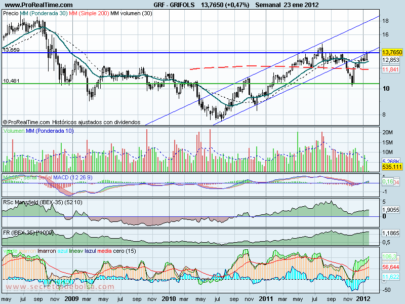 Grifols se ha mantenido en un canal alcista desde mediados del 2010 pero en el último trimestre del 2011 rompió el soporte y cayó hasta el soporte situado en la zona de los 10,50€. A partir de este punto se impulsó con fuerza cerrando los gaps que tenía abiertos y que comentamos en el último post y a cierre de la vela de la semana pasada rompió la resistencia situada en los 13,65€ con poca fuerza ya que aunque la vela fue altamente alcista no estuvo acompañada de volumen. De momento ayer cerró de nuevo por encima de la resistencia y hoy, por el momento está en verde.