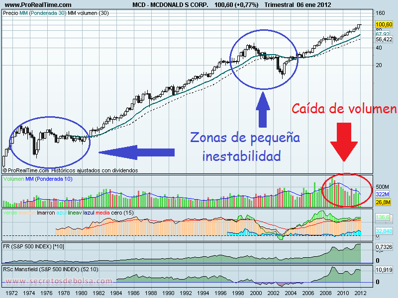 Si echamos un ojo a la gráfica histórica de la acción podemos ver cómo ha sido en la época en la que comenzó la inestabilidad económica mundial (2008) cuándo Macdonalds comenzó a mejorar su FR y su RSc Mansfield y a partir del 2010 las manos fuertes que ya tenían interés en el valor introdujeron todavía más capital en el mismo mientras la acción continuaba con su escalada. Sin embargo aunque esos dos indicadores nos proporcionen información sobre el momento actual tan bueno por el que está pasando el subyacente es importante fijarse en la caída de volumen que está arrastrando desde concretamente el año 2008. Este dato nos da información sobre el hecho de que el valor está perdiendo fuerza en la subida.
