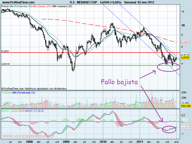 En primer lugar decir que el precio sigue en el canal bajista en el que entró a principios del 2011 hace ya un año,del que está testeando la resistencia del mismo cuando un mes antes hizo un doble suelo en el soporte crítico de los 3,83€. Pero, si salir de este canal bajista ha comenzado a dibujar un canal lateral de resistencia los 5,2€ y de soporte los ya mencionados 3,83€.