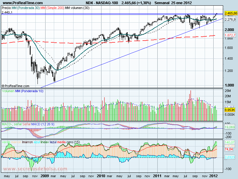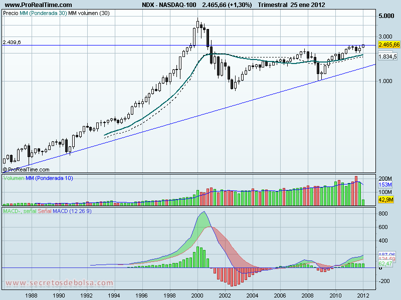 Después de la carrera alcista a la que nos acostumbró el Nasdaq desde sus comienzos sobre el año 1986 hasta principios del 2000 comenzó una etapa de grandes caídas que llevó al índice desde los 4.860 puntos hasta los 790 puntos alcanzados en octubre del 2002. A partir de ahí fue ascendiendo lentamente hasta que una vez alcanzados los 2.230 puntos a finales del 2007 volvió a sufrir una rectificación cayendo hasta los 1.000 puntos. Pero desde que alcanzó este valor continuó ascendiendo superando el último máximo alcanzado en los 2.230 puntos.