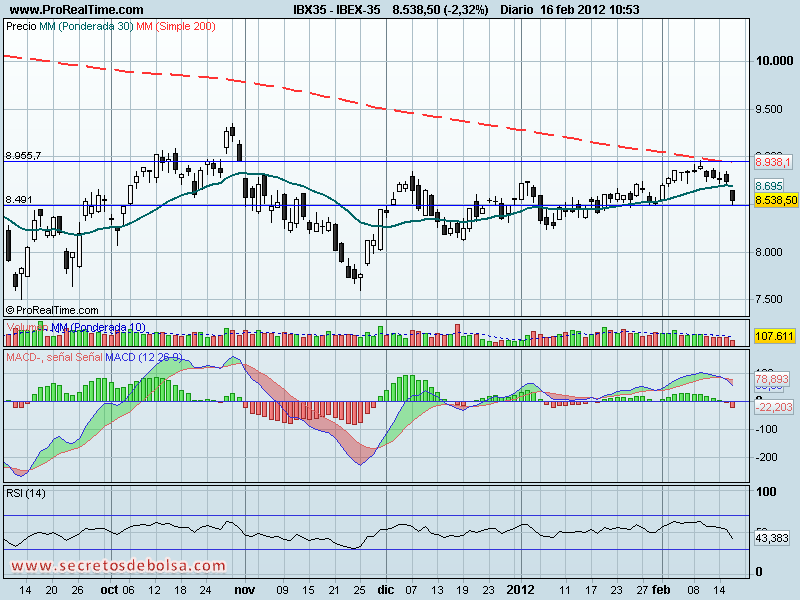 En el Ibex 35 tenemos dos gaps a tener muy en cuenta cómo ya vinimos comentando en artículos anteriores. El primero y por ahora el más lejano que es alcista sitúa en los 1.785 y 7860 puntos. El segundo que es bajista se encuentra en los 8.755 y los 8.995 puntos. Este último se ha cerrado pero parece que ha utilizado la parte alta del gap como resistencia y recortar para acercarse a la mm de 30 sesiones. Sin embargo el recorte se está convirtiendo en algo más que un simple recorte ya que estamos alcanzado cifras que podrían dar la primera voz de alarma para abandonar este pequeño rally que estamos disfrutando.