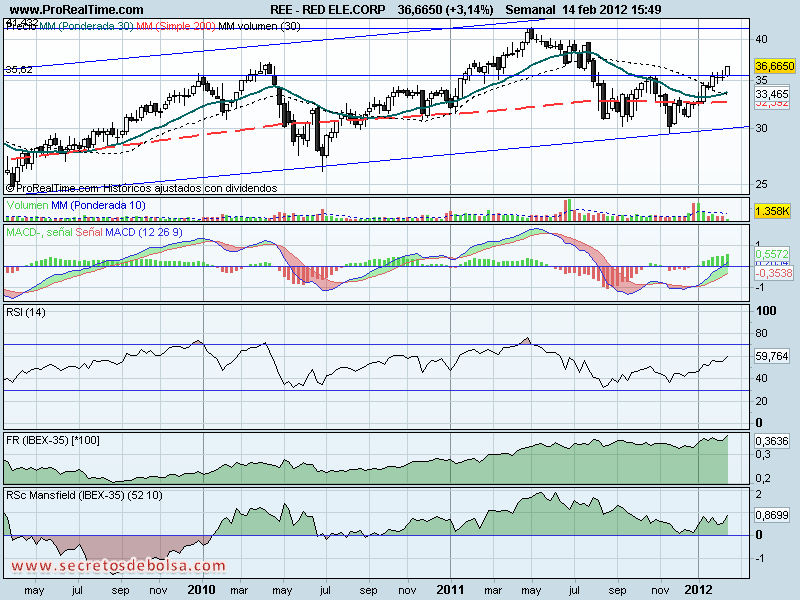 Desde ese momento el precio subió algo más alcanzando los 35,8€ para posteriormente volver a caer y testear de nuevo el soporte del canal. Una vez se apoyó en ese soporte Red Eléctrica comenzó un pequeño rally alcista en el que todavía nos encontramos. Pero este rally alcista parece que quiere ser más que eso pues en este tiempo la mm de 30 sesiones se ha tornado alcista, el precio cotiza por encima de dicha media y además a día de hoy (martes) la vela semanal está rompiendo la resistencia de los 35,8€.