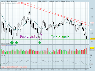 Cómo decíamos durante todo este tiempo nuestro selectivo se encontraba inmerso en un triángulo con sus subidas y bajadas. Pues bien, ha tocado un recorte y en este caso podríamos decir que es contundente. Hace algunos días, en un post hacíamos referencia al 61,80% de Fibonacci. Si el precio conseguía romperlo lo más probable era que se dirigiera a cubrir el gap anteriormente mencionado y así ha sido, y sólo ha necesitado cinco días desde el primer cierre de diario por debajo del retroceso del 61,80% para conseguirlo. Es más, el selectivo español ha corregido todo el tramo alcista que desplegó desde el 25 de noviembre del 2011.