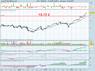 A finales de junio comentábamos en un post que Grifols se encontraba en una situación muy buena, ya que después de haber roto la resistencia de los 19,73€ se adentraba en un nueva zona digna de mención como es el terreno virgen.