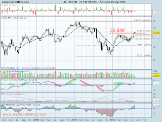 A principios del 2011 comenzó en Accor una caída que le llevó desde los 34,5€ a los 16€ alcanzados a finales de ese mismo año donde la mm de 30 sesiones que era totalmente bajista prácticamente no fue superada por el precio durante el período que duró esa caída.