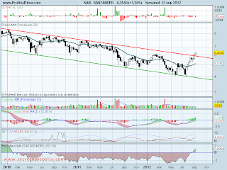 A no ser que se rompa con gran fuerza las resistencias a las que se enfrentan una vez roto el techo del canal (Santander: 6,20€, BBVA: 7€ y Telefónica: los 12,20€, lo más probable sea que comience una etapa lateral, de transición.