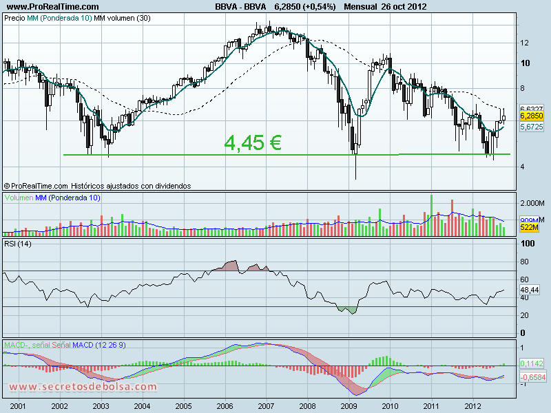 Y en mensual podemos ver como este impulso alcista tiene apoyo en un doble suelo en los 4,45€ de gran separación temporal (6 años) lo que le confiere una gran fortaleza.