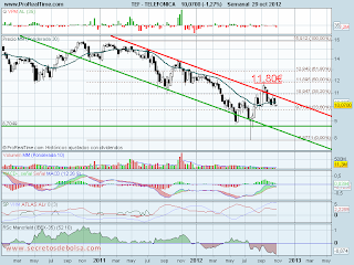 Como ya hemos comentado anteriormente, Telefónica entró en un canal bajista a principios del 2011 en el que ha estado inmerso todo este tiempo salvo ciertos momento en los que pretendía abandonarlo aunque no lo ha conseguido.