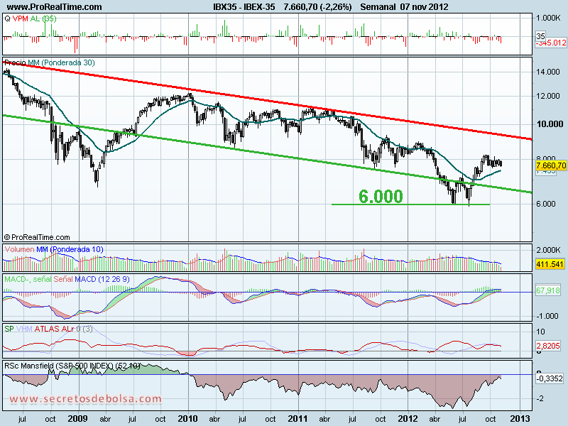 Si ahora ampliamos el marco temporal y analizamos el gráfico mensual observamos como se acaba de dibujar una divergencia alcista entre el precio y el Macd entre principios del 2009 y agosto del presente año. Debido a la lejanía temporal entre estos dos mínimos, la divergencia alcista adquiere una gran relevancia, por lo que es muy probable que volvamos a ver a nuestro índice por encima de los 8.000 puntos aproximándose poco a poco al objetivo mínimo de los 8.480 puntos, aunque para ello es necesario que en diario rompa la resistencia del canal lateral en el que, como ya hemos comentado, lleva aproximadamente 1 mes y medio.